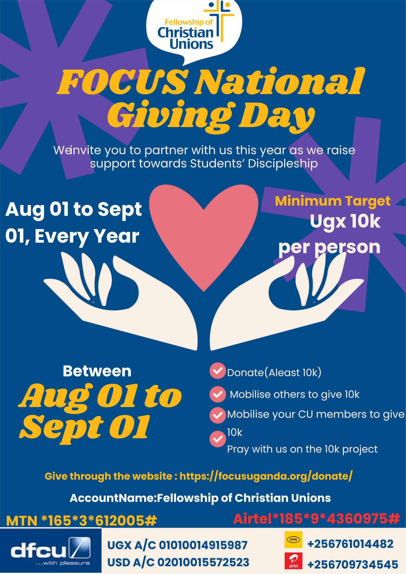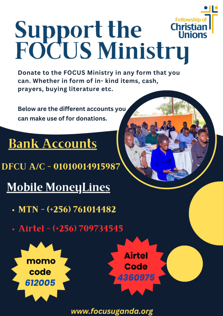 FOCUS Uganda is committed to sharing the good news of Jesus Christ on university and college campuses; nurturing students to grow and become effective witnesses of Christ and leaders in the church and society, through Evangelism Discipleship and Compassionate Empathy.