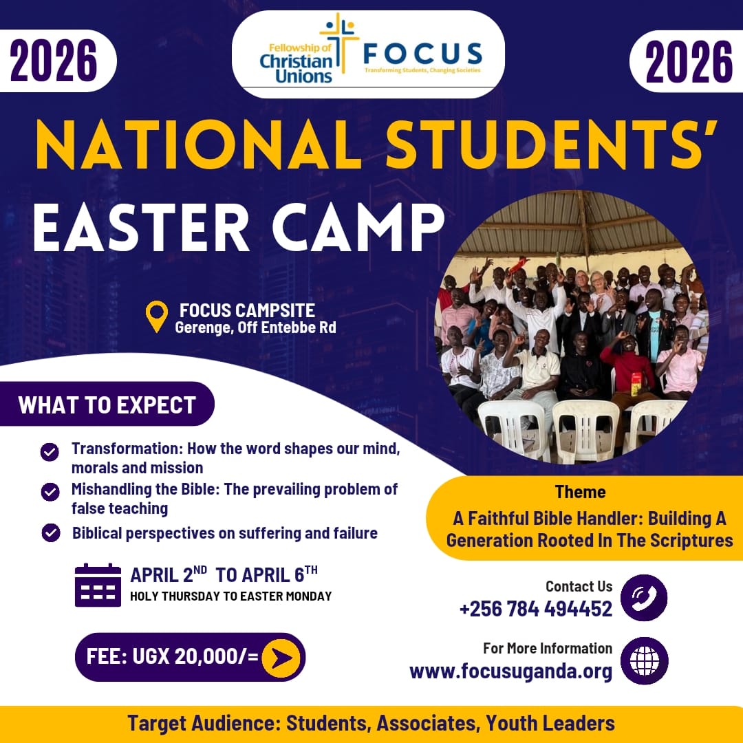 FOCUS Camping Site Gerenge Entebbe, UgandaFOCUS organizes the Annual National Students’ Camp that runs during the Easter holiday. This year’s Camp will run from 02nd to 06th April, 2026 at the FOCUS campsite in Gerenge Entebbe. The cost of attending the conference is Ugx.20,000 per [...]